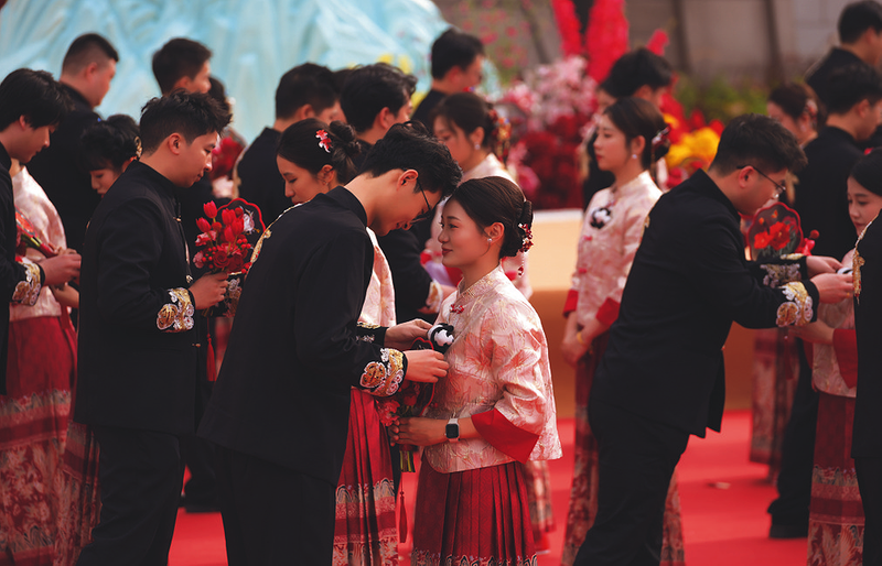 11月15日,中铁建工第四届“工聚良缘 筑爱同行”员工集体婚礼在成都市东安阁举行,60对新人参加活动。图为交换信物。 孙臣晨 摄