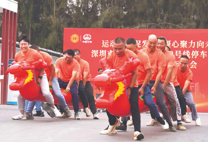 近日,中铁四局深圳市城市轨道交通22号线停车场项目部举办产业工人趣味运动会。图为旱地龙舟比赛。 李永 摄