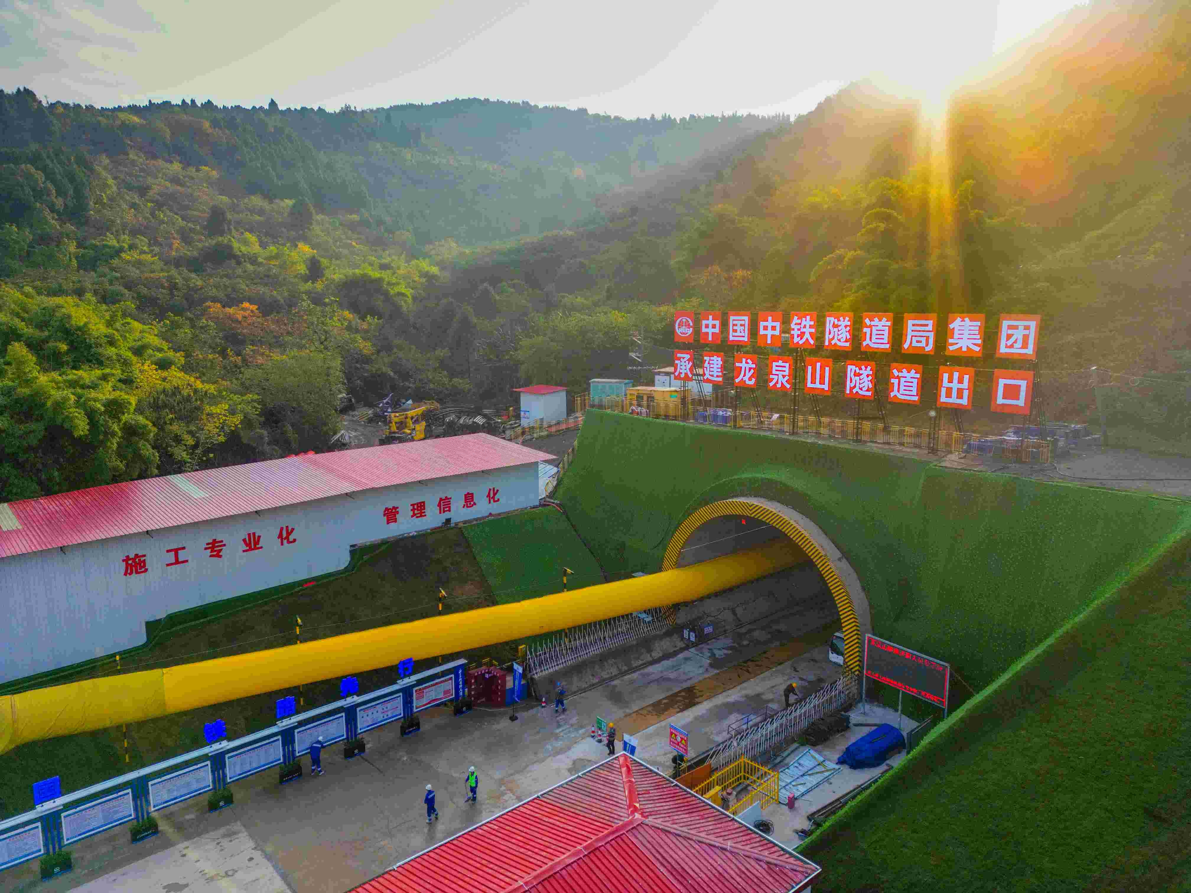 1月29日,中铁隧道局承建的成渝中线高铁控制性工程——龙泉山隧道贯通,至此成渝中线铁路(四川段)26座山岭隧道全面贯通,为后续无砟轨道和铺轨施工创造了有利条件。中铁隧道局承担成渝中线高铁3标工程建设,施工内容包括“三隧两桥三路基”。线路经过龙泉山城市森林公园及花果山风景名胜区,下穿上跨既有高速公路。3标隧道长15442米,穿越缓倾岩层并赋存瓦斯,施工环水保要求高、技术难度大、安全风险高。龙泉山隧道8027米,出口工区是成渝中线高铁四川段唯一设计并执行隧道全工序机械化施工的重要工点。